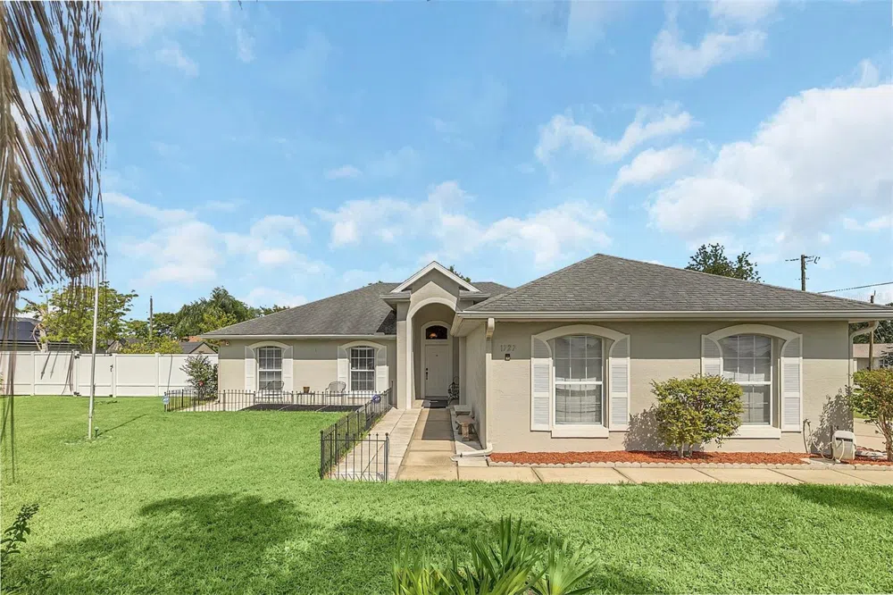 Nestled in Deltona Lakes, this lovingly maintained 3 bed, 2 bath home offers the perfect blend of comfort, style, and functionality. Situated on a large corner lot, with a fully fenced backyard, this home provides ample space for outdoor activities, gardening, and more! As you step inside, you'll be greeted by the family room and dining room, featuring brand new engineered hardwood floors and a vaulted ceiling that enhances the open and airy feel of the space. The kitchen comes complete with a pantry, a large window that fills the room with natural light, and a cozy eat-in area perfect for casual meals. There is also a breakfast bar to grab a quick bite. The inside laundry closet is a plus. The homes thoughtful split floor plan ensures privacy and convenience. The spacious primary bedroom is a true retreat, boasting an ensuite bathroom with a garden tub, a separate shower stall, and abundant natural light- your personal spa-like oasis. The two secondary bedrooms are located on the opposite side of the house, sharing a bathroom with a tub-shower combination, making it ideal for family or guests. Additional features are a separate dining room (which could also serve as an office) and a nicely screened-in back porch where you can relax and enjoy the outdoors. The exterior of the home is equally impressive. Freshly painted in 2023, the fully fenced backyard provides privacy and security, and includes two storage sheds for all your outdoor equipment. The attached two-car garage offers plenty of space for vehicles and additional storage. Don't miss the opportunity to make this exceptional property your own! This location is 40 minutes from the beach, and just one hour from the theme parks! Call for an appointment today!